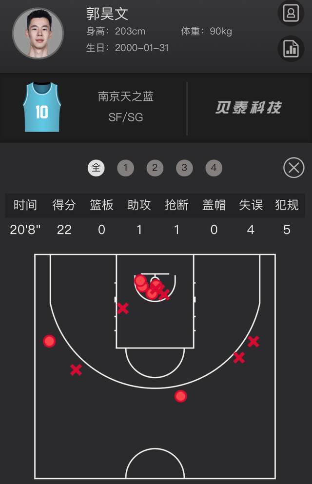 尽管出战时间只有20分钟,但他手感是真好,他13投6中,高效砍下22分1助攻1抢断。如果不是因为犯规,让郭昊文打满全场的话,再次轰下40+,绝非难事。要知道,对阵广东男篮,郭昊文可是砍下了42分的。
